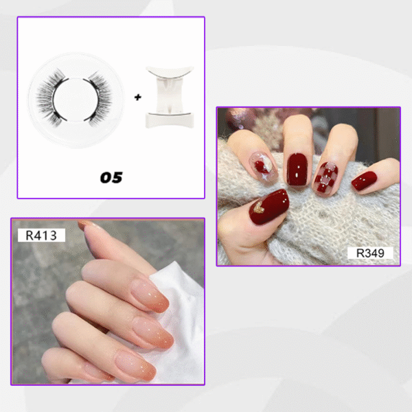 Elevate your everyday glam with this combo featuring bold voluminous lashes and two nail sets that balance chic elegance with modern art. Perfect for both parties and daily wear.
